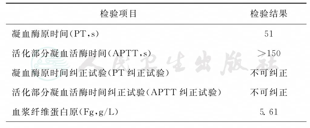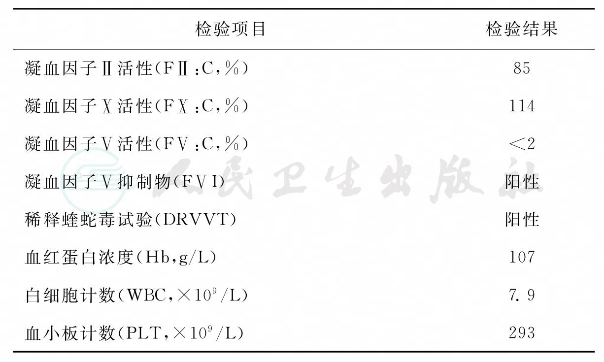 患者入院时实验室检验结果见表1;出院后2个月内检测凝血因子Ⅴ抑制物(FⅤI)和狼疮样凝血抑制物为阴性。