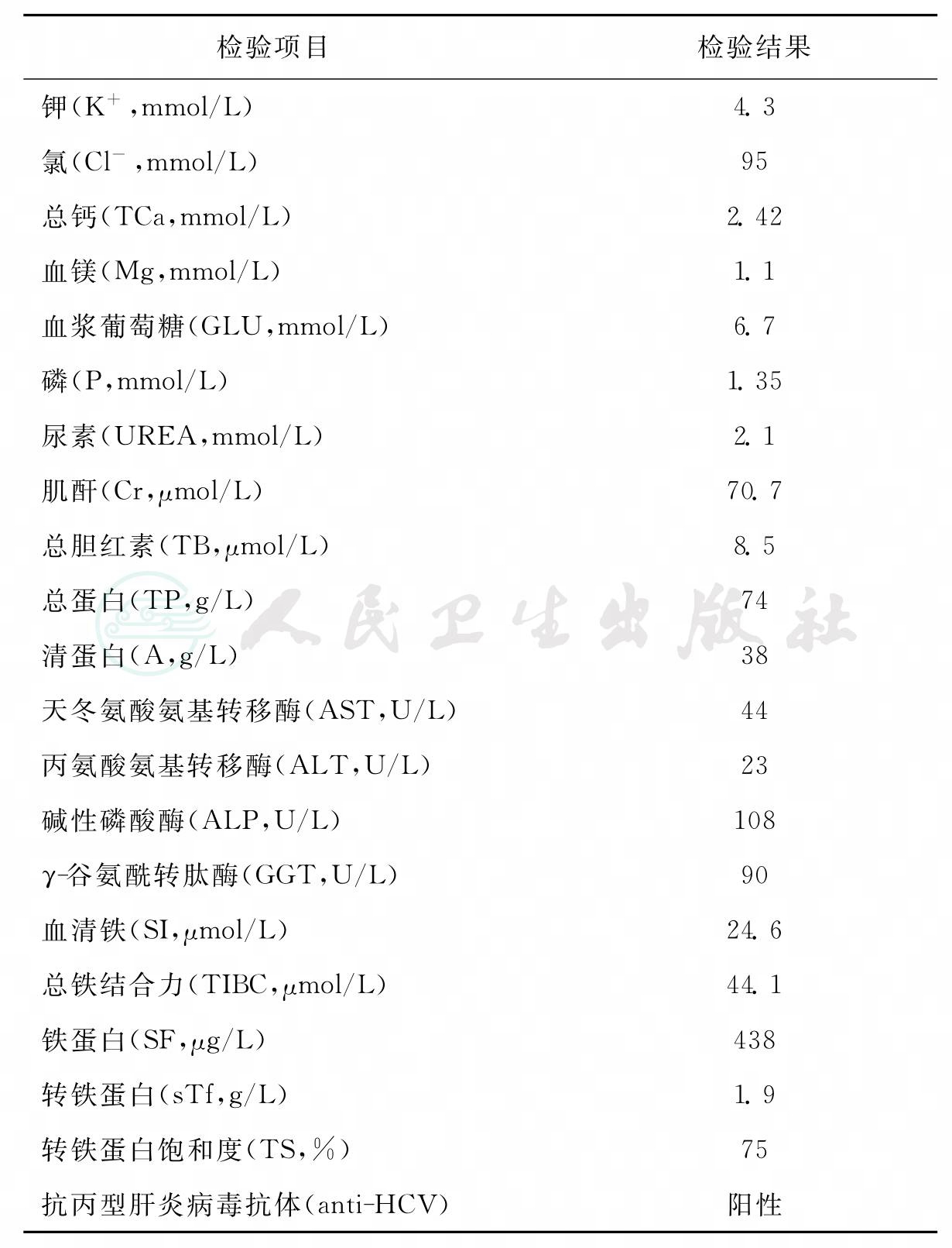 实验室检验主要结果见表1。基因检测显示:HFE C282Y突变纯合子。