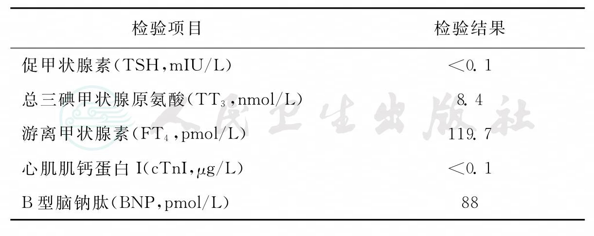 患者:女性,60岁。症状:主诉出汗、心悸、震颤加重1周。1周前有恶心、呕吐、水样腹泻、出汗、震颤、神经过敏、发冷及心悸。2年间,体重减低27kg、慢性脱发和间歇性心悸。目前,无呼吸困难、视力变化、吞咽困难和服用药物。既往史:2年前,诊断为甲状腺功能亢进症(甲亢),予以丙硫嘧啶、类固醇和β受体阻断药治疗。家族史:父亲患甲亢,一个女儿患Graves病。但无高血压、糖尿病或冠心病家族史。体格检查:体温36.2℃,血压160/103mmHg,心率196次/分,呼吸16次/分;大汗淋漓、恶病质、巩膜黄染。颈部触及甲状腺肿块,但无疼痛,右侧甲状腺有结节和双侧有杂音;心脏检查示Ⅲ/Ⅳ级收缩期杂音,放射到腋下,有房颤;颈静脉高压,四肢明显震颤。其他检查:白细胞计数(WBC)15.5×109/L,中性粒细胞计数(N)84%和核左移,外周血涂片检查见中性粒细胞中毒颗粒。甲状腺过氧化物酶抗体(TPO-Ab)阴性。右心室功能减低及左心室射血分数(LVEF)为15%。131I-摄取率>2(参考范围:0.8~1.1)。