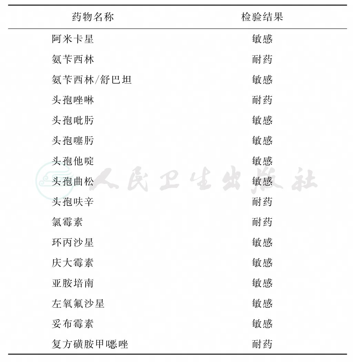 患者:女性,18岁。症状:剧烈头痛、腿部疼痛,伴恶心呕吐。患者在中枢神经系统(CNS)手术处有液体渗漏。在采集脑脊液(CSF)标本前,患者服用罗非昔布(罗非考昔)、地塞米松和法莫替丁。在采集CSF后,对患者行万古霉素联合头孢噻肟治疗。既往史:不详。其他检查:CSF外观微黄,显微镜革兰染色查见白细胞及革兰阳性球菌。经巧克力琼脂培养查见革兰阴性杆菌菌落,转种至麦康凯琼脂生长,乳糖非发酵;硫代硫酸钠肉汤中生长革兰阴性杆菌/球杆菌;再次革兰染色查见极少量革兰阴性球杆菌;5%羊血TSA平板上生长菌落,革兰染色查见大量革兰阴性球杆菌,鉴定为革兰阴性醋酸钙不动杆菌/鲍曼不动杆菌复合物。