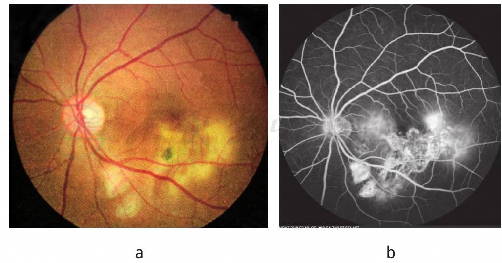 a. 眼底脉络膜病变;b. FFA:左眼颞下血管弓处可见大片斑驳样高荧光,晚期视盘鼻侧边缘轻渗漏,