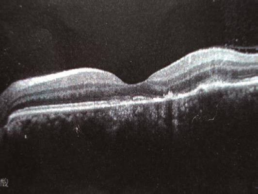 2005年12月前左眼眶胀伴视力下降,当地医院眼底检查:黄斑区视网膜下渗出,FFA黄斑区渗漏,诊断为急性色素上皮炎。治疗不详。