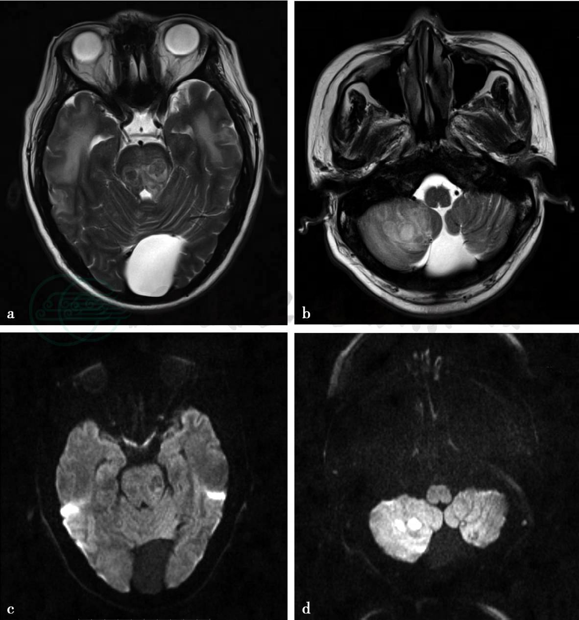 图2 a,T2WI见双侧大脑脚呈类圆形等或稍高信号病变,周边伴有水肿。双侧颞叶片状水肿,后颅窝可见蛛网膜囊肿。b,T2WI见右侧小脑半球两枚类圆形高信号病变,灶周可见水肿。c,DWI上双侧大脑脚病变无明显扩散受限,呈略低信号。d,DWI上右侧小脑半球病变扩散受限呈明显高信号。e~f,T1WI增强扫描见双侧大脑脚病变呈环状或多房状强化,双侧颞叶另可见多发小环状强化灶。右侧小脑半球病变呈环状强化,双侧小脑半球可另见多发环状或结节状强化灶