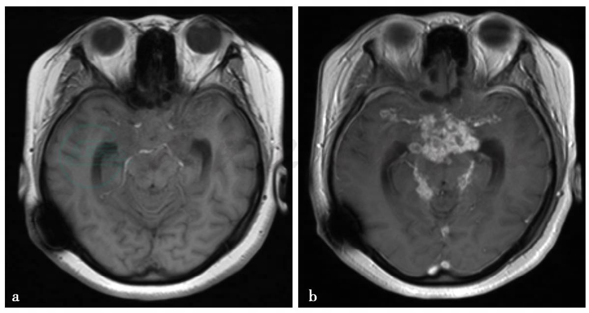 图1 a,T1WI见鞍上池、环池闭塞,正常低信号脑脊液影消失,成等信号影。b,T1WI增强扫描见鞍上池、环状内多发环状、小结节状、条片状强化