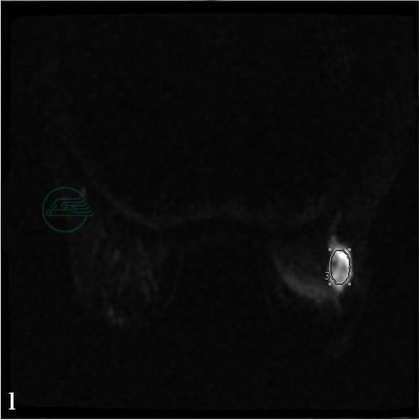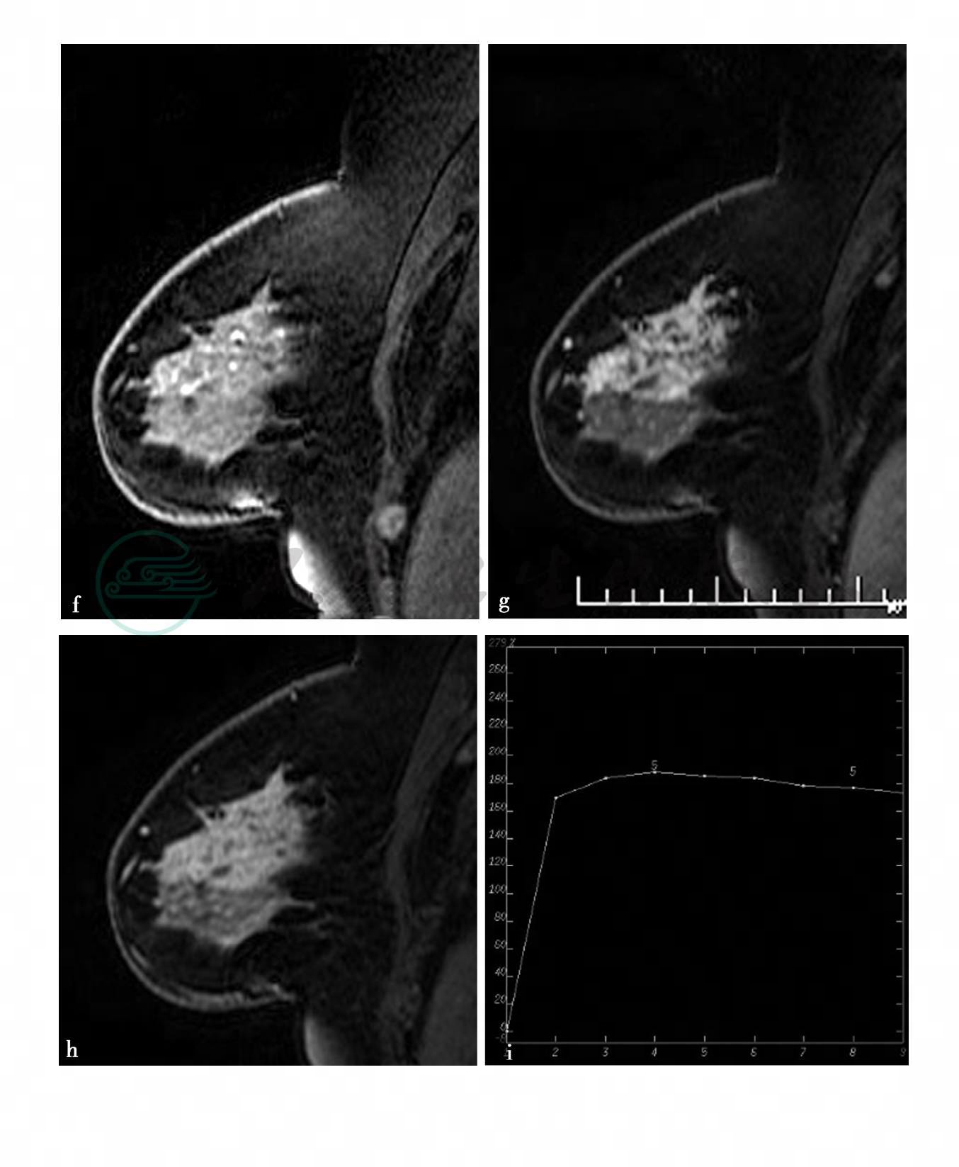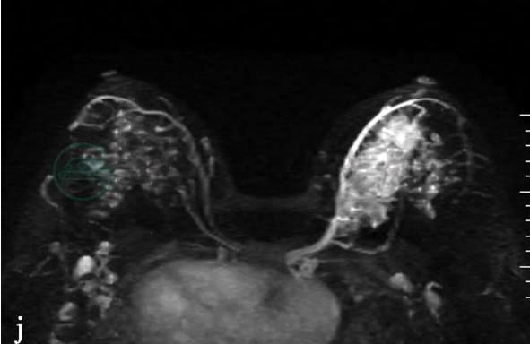 图2 图2f~h,分别为MRI动态增强前及增强后1min、8min。图2i,病变时间-信号强度曲线图。图2j,MIP图示病变侧血管较对侧明显增粗、增多,皮肤未见明显异常,腋下未见肿大淋巴结。图2g、h,分别为动态增强MRI示左乳中上方片状不均匀强化,整体呈段性分布。图2I,病变区时间-信号强度曲线呈平台型,范围约5.0cm×3.3cm