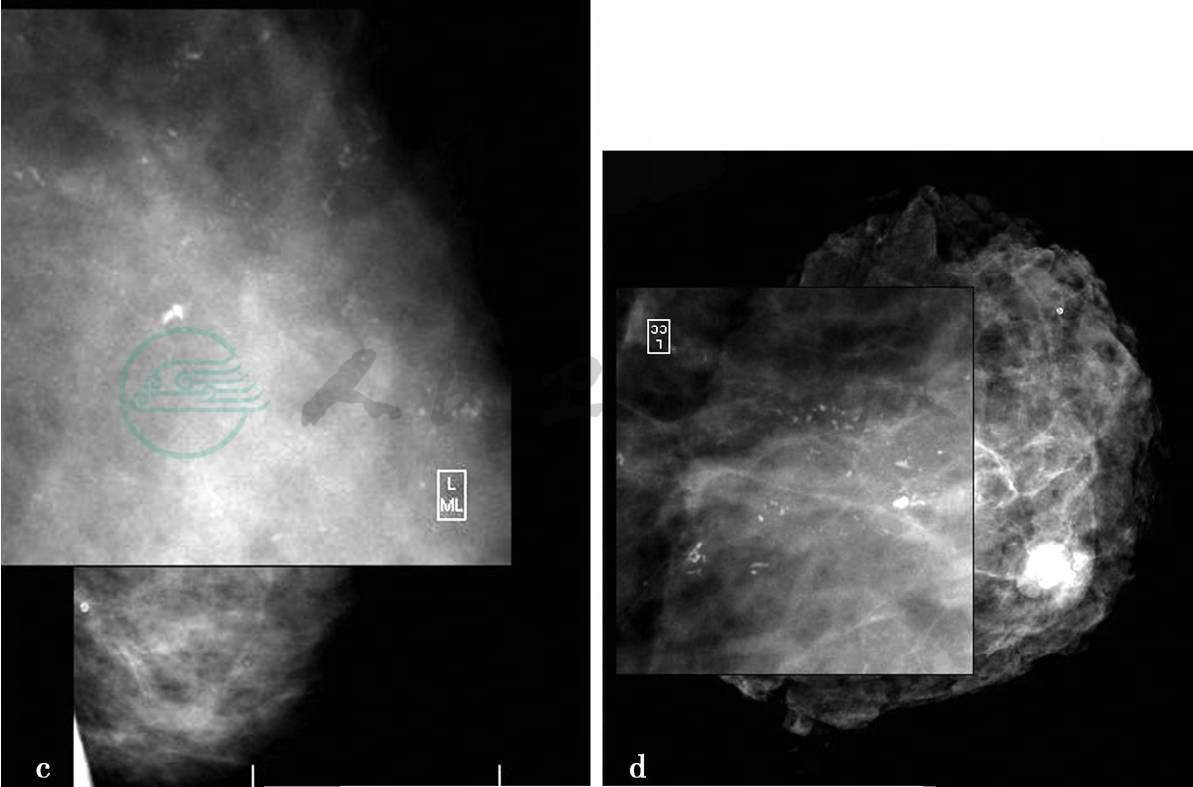 图1 图1a,左乳X线头尾位。图1b,左乳X线内外斜位。图1c,左乳钙化区局部放大片。图1d,切除标本钙化区局部放大片。X线显示双乳呈致密型乳腺,左乳中上可见多发不定型及模糊的细小钙化,呈多发成簇的区域性分布,该钙化于放大片显示明显(图c),局部腺体结构不良,未见明确肿块。图1e,左乳病变二维超声图。超声显示左乳中上方腺体局限增厚,厚度约2.3cm,内部回声致密、增强、不均匀,其内可见约0.8cm×0.6cm不规则低回声反射区,边界不清,内部回声不均匀,其中可见多发点状强回声钙化