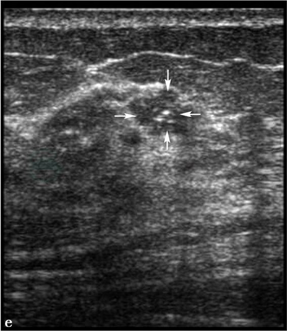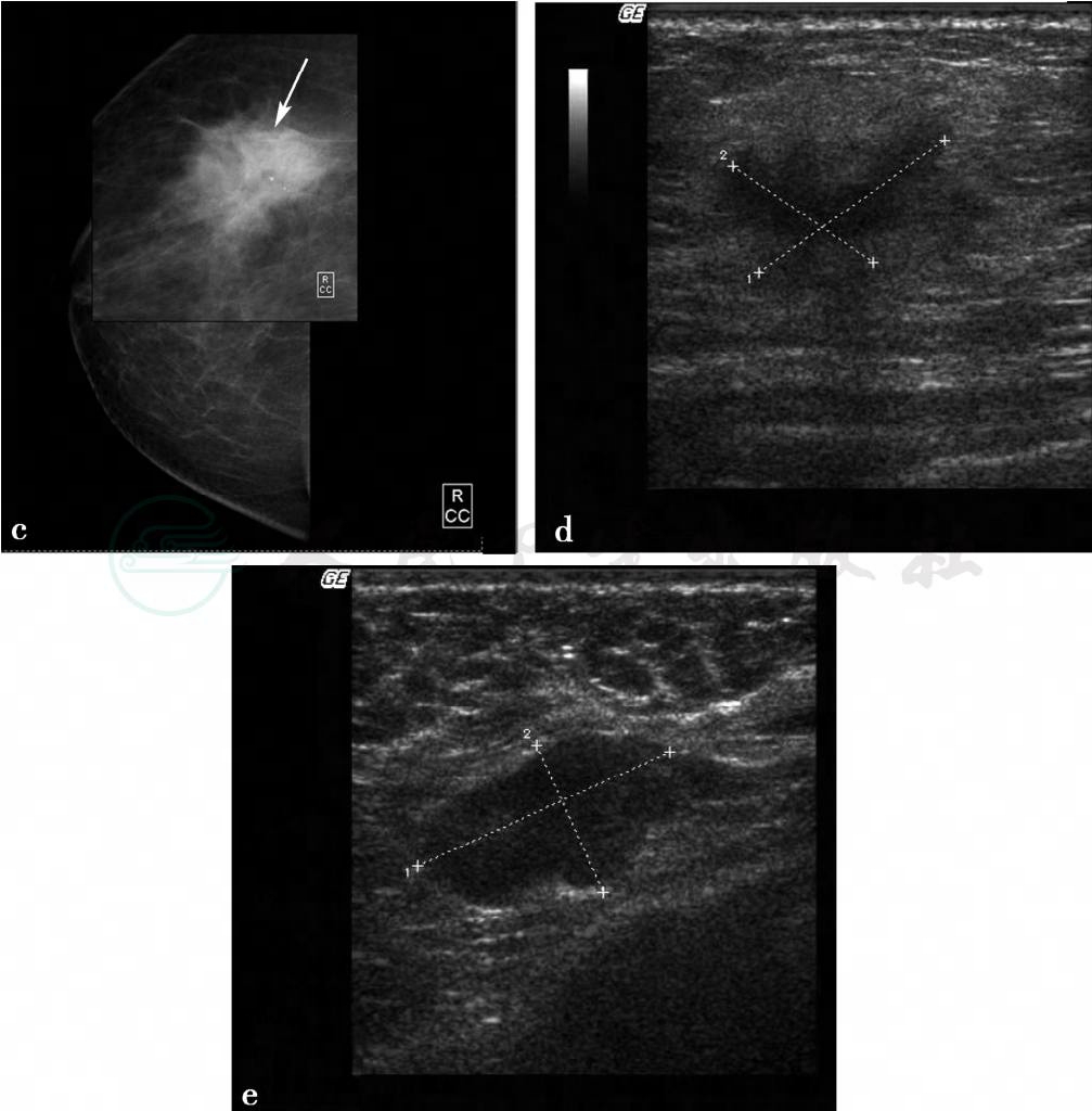 图3 图3a,右乳X线头尾位。图3b,右乳X线内外斜位。图3c,右乳病变局部放大片。X线显示右乳呈脂肪型乳腺,右乳外上不规则分叶状肿物(图箭头所示),大小约1.8cm× 2.3cm,边缘呈蟹足状浸润,其内可见2枚点状钙化,皮下脂肪层清晰,皮肤及乳头正常。图3d,右乳病变二维超声图,超声显示右乳外上1.5cm×2.0cm低回声反射区,形状不规则,边界不清楚,边缘呈蟹足状浸润,内部回声不均匀,肿物后方可见声影。图3e,右腋下淋巴结二维超声图,右腋下可见1.3cm× 2.3cm肿大淋巴结,正常淋巴结门结构消失