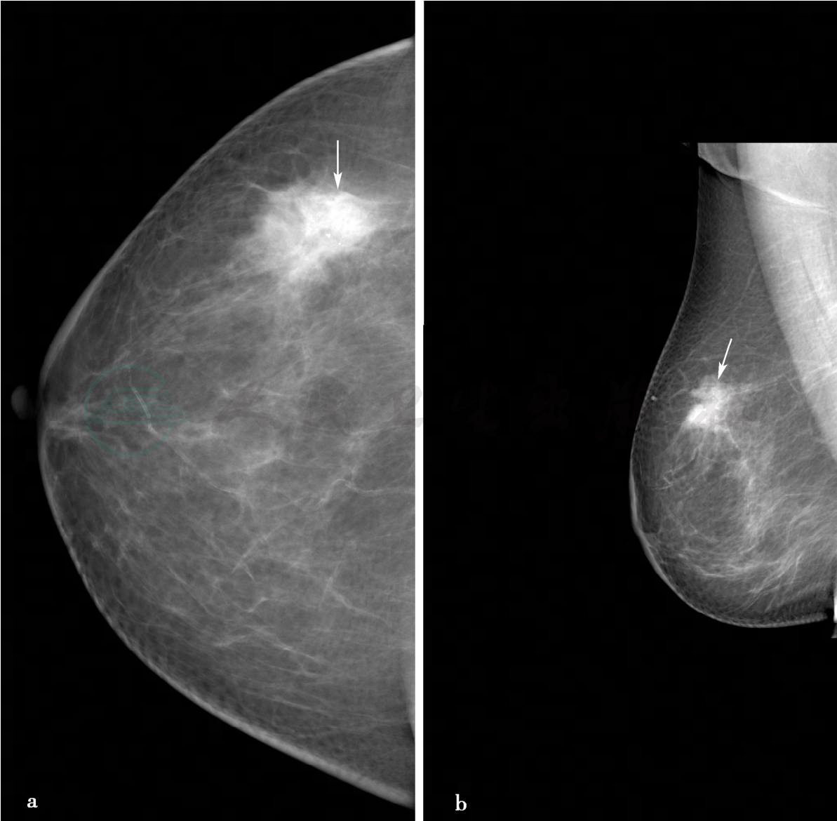 (2)病例3,女性,71岁,右乳无痛性肿物伴右腋下肿物发现4天。体格检查:右乳外上距乳头4.0cm处可触及3.5cm×4.0cm肿物,质地硬,边界不清,活动度差,右腋下触及一直径2.0cm的肿大淋巴结,质地硬,活动度可。