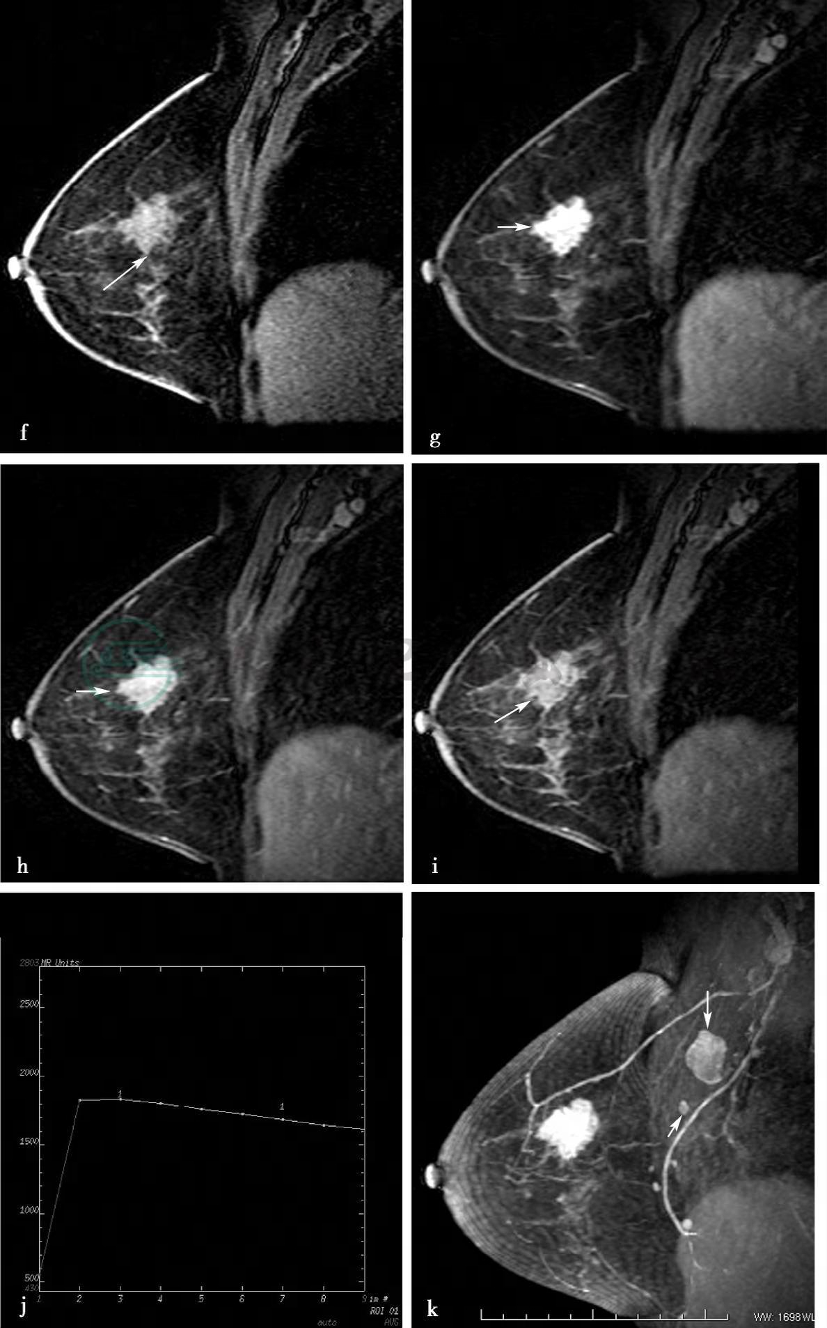 图4 图4f~i,分别为MRI动态增强前及增强后1min、2min、8min。图4j,病变时间-信号强度曲线图。图4k,MIP图。图4l,右乳病变DWI图。MRI显示右乳外上方不规则肿物,大小2.0cm× 3.0cm,边缘细小分叶及毛刺,动态增强后肿物呈明显强化(图g、h、i箭头所示)。图4j,时间-信号强度曲线呈“快进快出”流出型。图4k,右腋下相当于胸外侧动脉周围可见多发淋巴结,其中最大者为1.8cm×2.2cm(箭头所示)