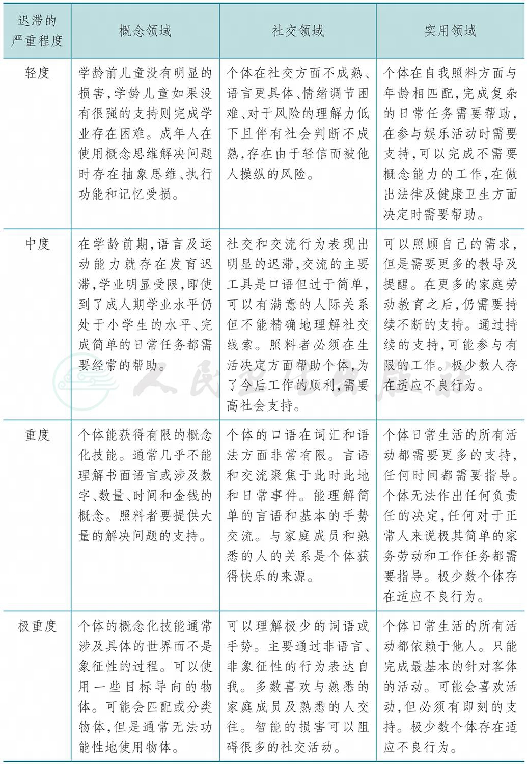 | 轻度 | 学龄前儿童没有明显的 损害,学龄儿童如果没 有很强的支持则完成学 业存在困难。成年人在 使用概念思维解决问题 时存在抽象思维、执行 功能和记忆受损。 | 个体在社交方面不成熟、 语言更具体、情绪调节困 难、对于风险的理解力低 下且伴有社会判断不成 熟,存在由于轻信而被他 人操纵的风险。 | 个体在自我照料方面与 年龄相匹配,完成复杂 的日常任务需要帮助, 在参与娱乐活动时需要 支持,可以完成不需要 概念能力的工作,在做 出法律及健康卫生方面 决定时需要帮助。 |