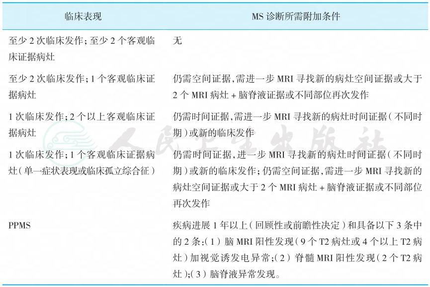 | 至少2次临床发作;至少2个客观临 床证据病灶 无 至少2次临床发作;1个客观临床证 据病灶 仍需空间证据,需进一步MRI寻找新的病灶空间证据或大于 2个MRI病灶+脑脊液证据或不同部位再次发作 1次临床发作;2个以上客观临床证 据病灶 仍需时间证据,需进一步MRI寻找新的病灶时间证据(不同时 期)或新的临床发作 1次临床发作;1个客观临床证据病 灶(单一症状表现或临床孤立综合征) 仍需时间证据,进一步MRI寻找新的病灶时间证据(不同时 期)或新的临床发作;仍需空间证据,需进一步MRI寻找新的 病灶空间证据或大于2个MRI病灶+脑脊液证据或不同部位 再次发作 PPMS 疾病进展1年以上(回顾性或前瞻性决定)和具备以下3条中 的2条:(1) 脑MRI阳性发现(9个T2病灶或4个以上T2病 灶)加视觉诱发电异常;(2) 脊髓MRI阳性发现(2个T2病 灶);(3) 脑脊液异常发现。 |