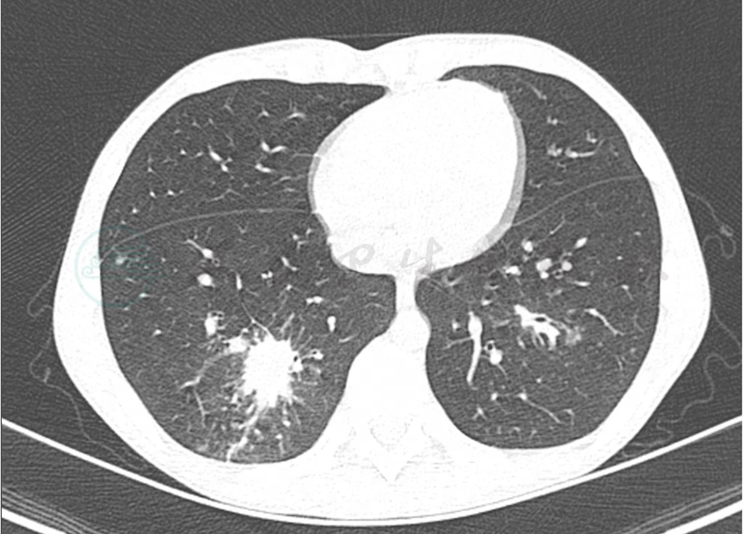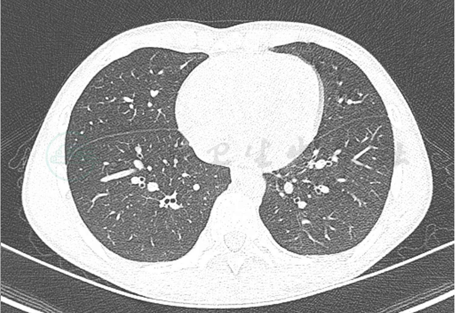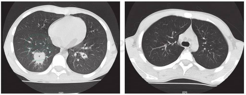 现病史:患儿1年前因“多饮多尿”于内分泌科诊断为1型糖尿病后院外间断未按规则应用胰岛素皮下注射治疗(具体不详),血糖控制不佳。1个月前患儿出现多饮多尿加重,日间饮水量约2000ml,日小便4~5次,每次尿量约500ml,夜尿增加,但量不详。7天前恶心、呕吐,为胃内容物,非喷射性,伴有腹痛,随之出现烦躁,意识不清,于当地医院住院治疗。血糖23.0mmol/L。血气分析:pH 6.99,考虑“酮症酸中毒”,给扩容补液胰岛素治疗。5天前患儿出现持续高热,体温波动在39.0℃左右,昏迷,球结膜水肿,咳嗽伴呼吸困难,少尿,转诊于笔者医院,收入PICU治疗,予气管插管呼吸机辅助通气,插管内可见新鲜血涌出,肺CT提示右肺下叶球形实变影,考虑肺部感染,给予头孢噻肟舒巴坦钠抗感染,胰岛素持续静脉滴注4天后患儿清醒,自主呼吸良好,监测血气正常,撤机,血糖波动在12mol/L左右,改为皮下胰岛素注射。但患儿仍有发热,发热间隔8~12小时,阵发性咳嗽,可咳出少许白痰伴血丝,复查肺CT提示右肺下叶球形实变影面积增大,为求进一步诊治,转入笔者科室继续治疗。