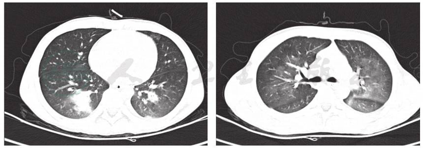辅助检查:血常规:白细胞计数10.3×109/L,中性粒细胞百分比84.2%,淋巴细胞百分比8.3%,红细胞计数4.36×1012/L,血红蛋白126g/L,血小板 150×1012/L;CRP 87.2mg/L;降钙素原7.22ng/ml;DIC基本正常;肝功能正常;痰培养未见细菌真菌生长;血培养未见细菌生长;6天前肺CT显示双肺多发渗出,以右肺下叶为主伴有实变,双侧胸腔积液(图1);入院前1天肺CT显示双肺下叶实变范围较前增大。双侧胸腔、右侧叶间积液较前减少(图2)。