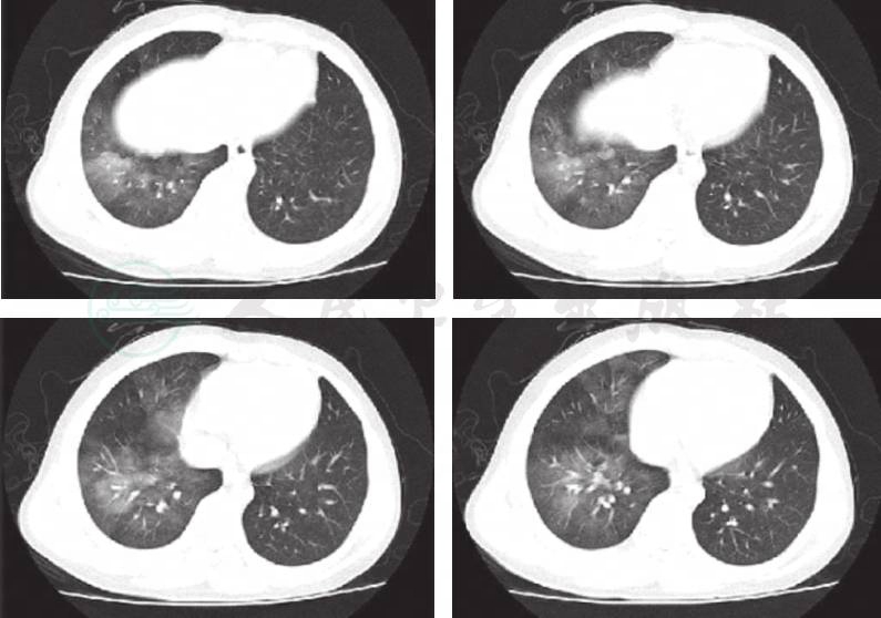 图2 右肺中下叶见磨玻璃密度斑片影。右肺中下叶渗出病变,结合病史考虑肺泡内出血