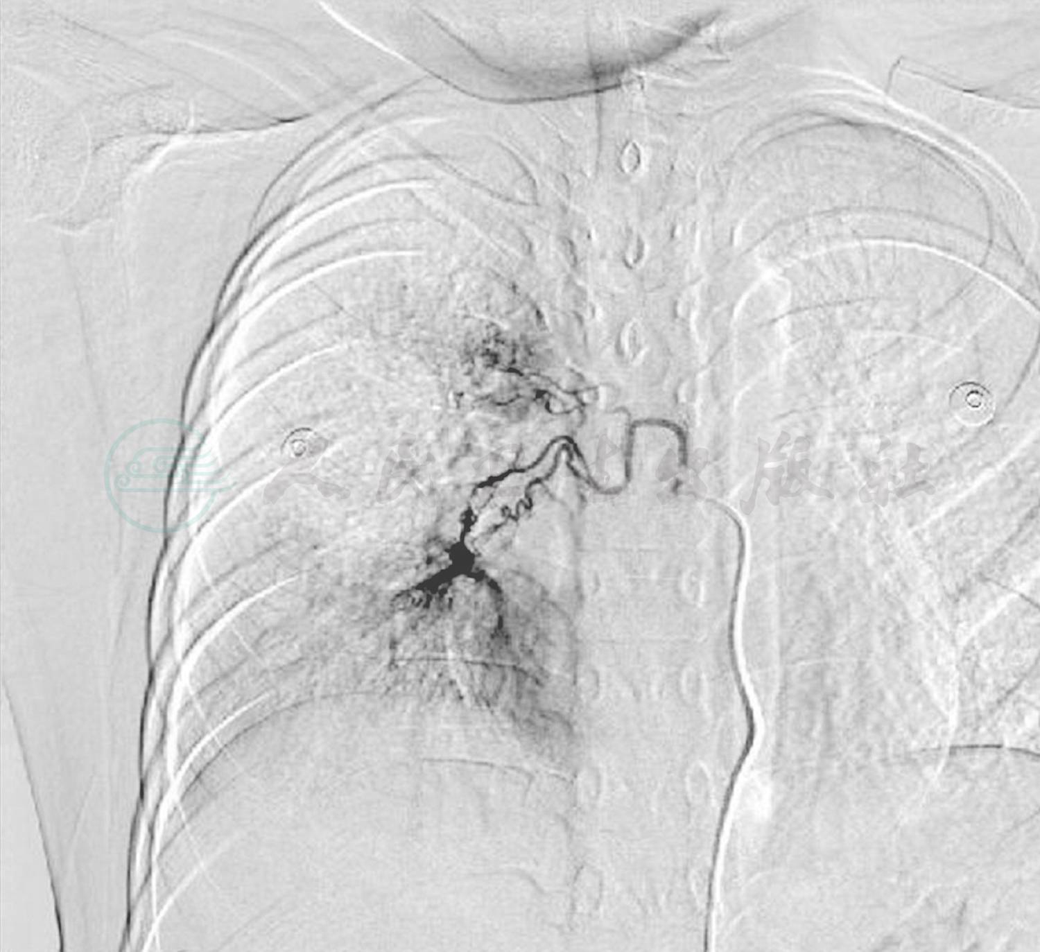 入院后急检血常规白细胞正常范围,予患儿头孢甲肟预防感染,同时完善病原学及相关常规检查。次日回报TB-Ab阴性;结核抗体阴性,肺炎衣原体抗体-IgM 阴性;肺炎支原体抗体-IgM 阴性,暂无结核、肺炎支原体及衣原体感染的证据;血红蛋白92g/L,提示轻度贫血。抗核抗体、抗nRNP抗体、抗Sm抗体、抗SS-A抗体、抗dsDNA抗体均阴性;抗线粒体抗体均为阴性;抗心磷脂抗体(ACA)、抗中性粒细胞胞质抗体测定(ANCA)及抗核抗体系列(ANA)均阴性,暂不支持系统性红斑狼疮等结缔组织病和ANCA相关性血管炎等引起的肺部损害。心电图正常,心脏超声正常不支持心源性咯血。入院第2天患儿再次咯血,量同前,检查血常规提示血红蛋白进行性下降提示肺部进行性出血,立即予患儿行支气管镜检查以明确出血部位,术中发现右肺下叶基底段可见鲜血涌出(图1),予1/10 000盐酸肾上腺素局部止血。因患儿出血量较大并急行肺部增强CT扫描提示:右肺中下叶见磨玻璃密度斑片影(图2),不除外肺血管异常导致出血,立即请介入科会诊,予患儿行支气管动脉造影术,术中发现血管略增粗扭曲,另见血管瘘(图3),予明胶海绵填塞后支气管动脉栓塞良好(图4)。夜间患儿再次出现呕血1次,约为50ml鲜血,患儿血氧饱和度下降,予患儿低流量吸氧,并予患儿垂体后叶素持续静脉滴注,联合凝血酶及酚磺乙胺止血并积极补液输血纠正贫血治疗。肺灌洗液结核菌涂片阴性,PPD阴性,结合支气管镜下的改变可除外肺结核;肺泡灌洗液未查到含铁血黄素细胞不支持肺含铁血黄素沉着症。患儿共住院治疗1周,无发热,未再次咯血及活动性出血表现出院观察。出院后电话随诊,患儿出院后无再次咯血,无反复感染及咳嗽史。
