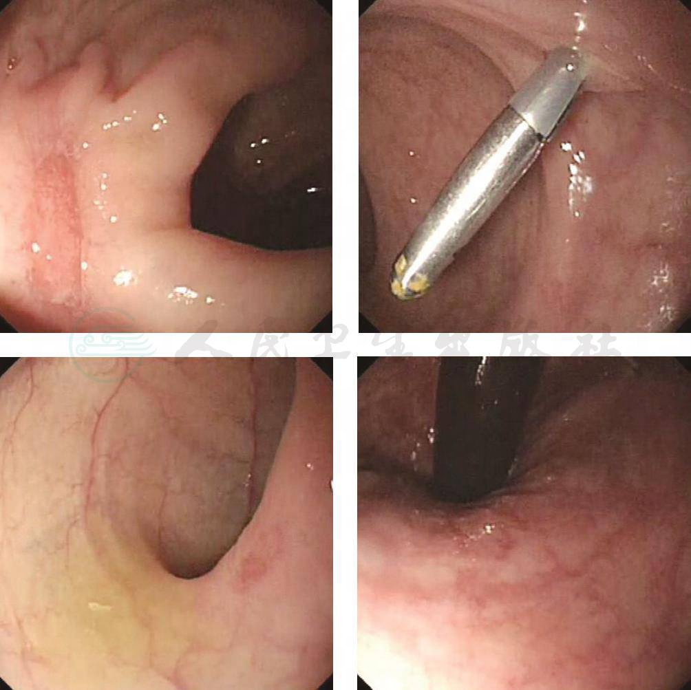 13.入院后病情变化 患者入院1周后头痛无好转,仍有发热,最高39.3℃,同时出现口腔溃疡、肛周溃疡,突发解鲜血便,伴血块,量约1 000ml,急诊肠镜及镜下止血。止血后复查肠镜(图2):进镜至回肠末段未见异常,回盲瓣呈唇形,舒缩正常。盲肠、升结肠、肝曲、横结肠脾曲、降结肠、乙状结肠、直肠黏膜充血水肿,血管纹理紊乱,全结肠可见散发大小不一溃疡愈合期改变,可见红色肉芽,较大者0.8cm×0.4cm,直肠可见一钛夹。结论:结肠多发溃疡,直肠溃疡出血治疗术后改变。