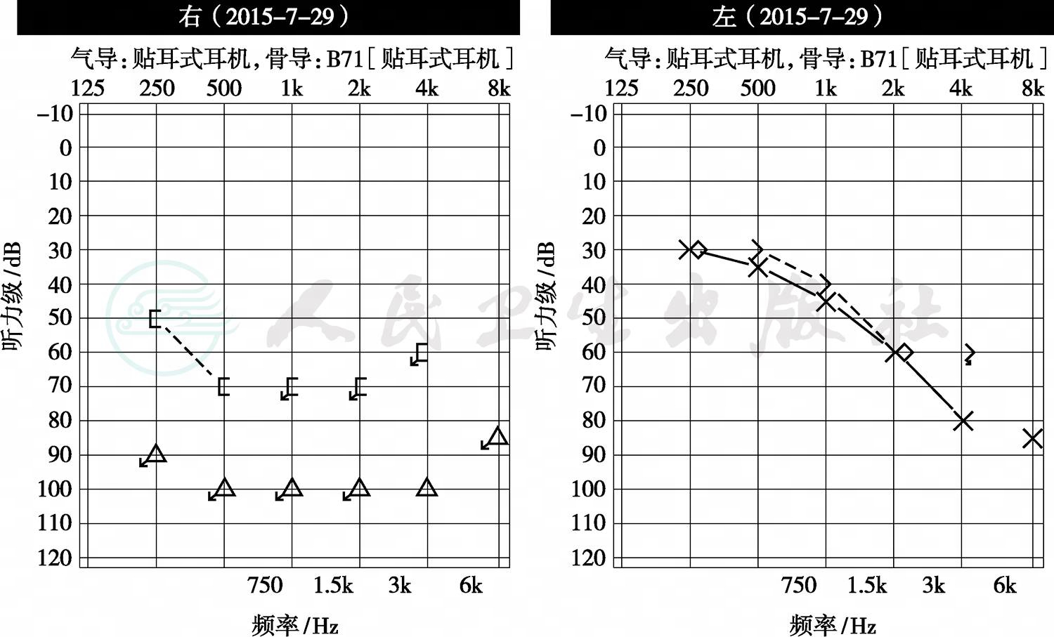 针刺试验为阴性,白塞综合征依据不足。眼科检查:视力基本正常,双眼结膜炎;双耳感音神经性耳聋(右耳极重度,左耳中重度)(图4),前庭功能正常;再次行腰穿示颅内压200mmH2O;常规示总细胞40×106/L、单核细胞80%、多核细胞20%;生化示基本正常范围;革兰氏染色+抗酸染色+墨汁染色示均为阴性;脑脊液培养示阴性。