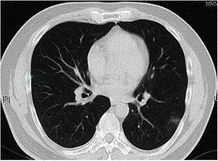 图2 氟康唑治疗1个月后复查胸部CT示:左肺下叶外侧基底段病灶较前明显吸收