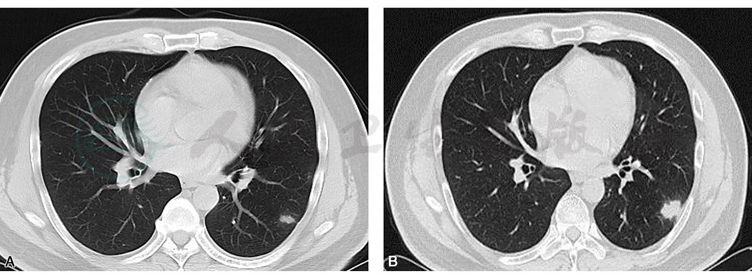 图1 胸部CT平扫:左肺下叶基底段多发斑片、结节影伴晕征(A);门诊抗生素治疗1个月后复查胸部CT示左肺下叶病灶较前明显进展(B)