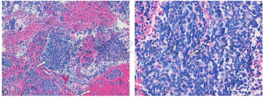 A.镜下见大量成团的体积较小的异形细胞,周围见出血及少量淋巴细胞(白箭)(HE,×100);B.高倍镜下见局部结构紊乱,细胞较小,呈燕麦状(白箭),核深染,核仁不清,胞质稀少,呈嗜碱性,符合小细胞癌表现(HE,×400)
