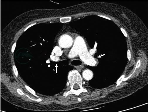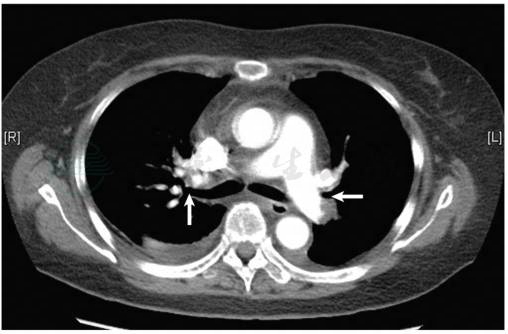 图2 肺动脉CTA示抗凝治疗2个月后双侧肺动脉血栓大部分溶解吸收(白箭)