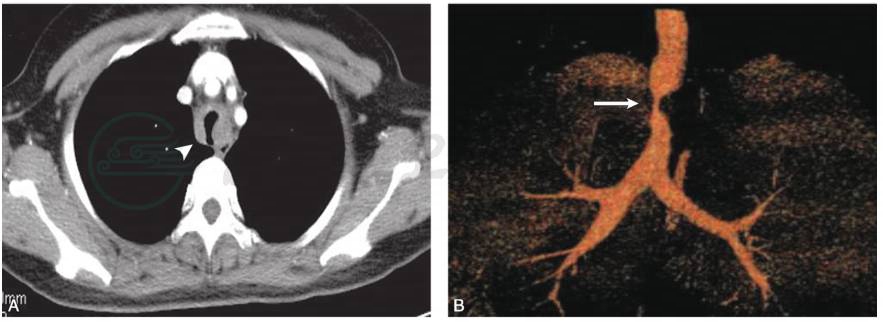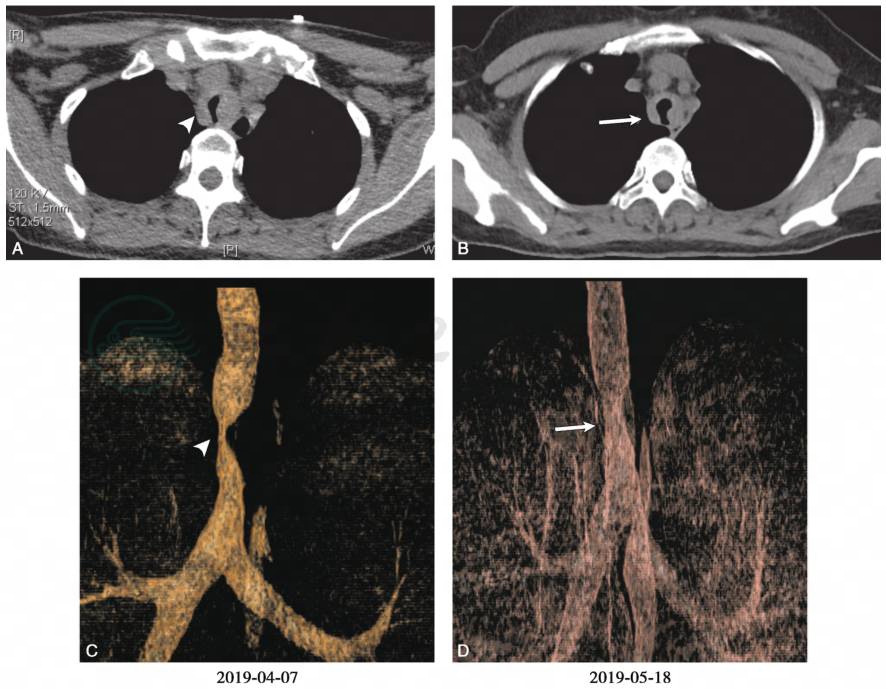 A.胸部CT增强示气管中段管壁环形增厚伴轻度强化(箭头);B.气道三维重建示气管管腔呈裂隙样狭窄(白箭)