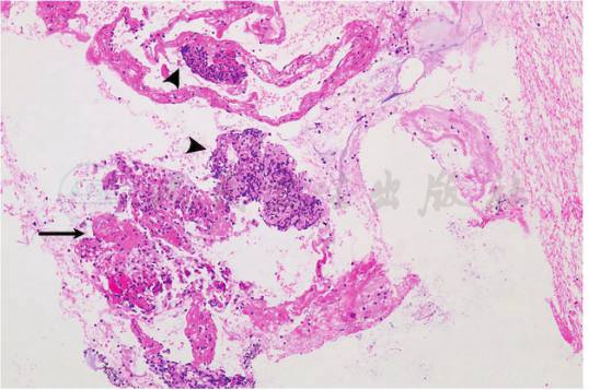 图5 活检组织内可见(HE,×100):慢性肉芽肿性炎症(箭头),纤维素性渗出及坏死(黑箭)
