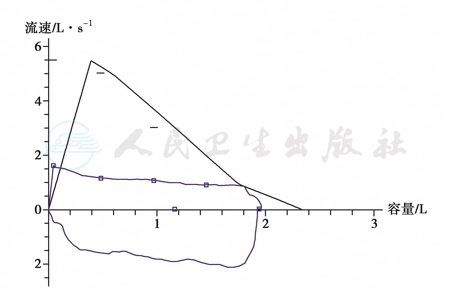图1 肺功能F-V曲线环示吸气相及呼气相双相平台样改变