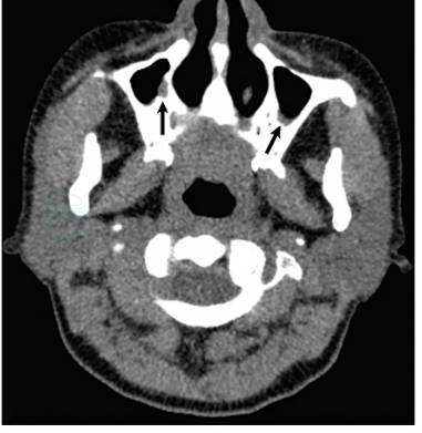图3 鼻窦CT示:双侧上颌窦局部黏膜增厚(黑箭)