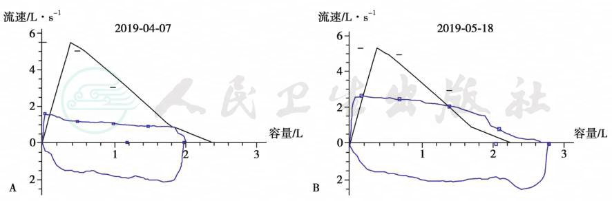 A.治疗前肺功能:FEV1:1.16L,PEF:1.6L/s,MEF 75:1.14/s,MEF 50:1.05L/s;B.治疗 1 个月后复查示通气功能明显改善,FEV1:2.07L,PEF:2.73L/s,MEF 75:2.52L/s,MEF 50:2.10L/s
