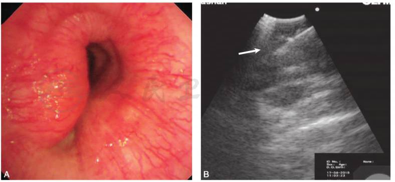 A.电子支气管镜示气管中段外压性狭窄70%~80%,距声门约7cm,黏膜表面光滑,伴充血;B.支气管镜超声于病变处可探及不规则低回声区(白箭)