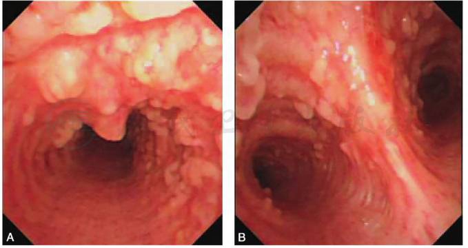图1 支气管镜检查:气管全程至隆突(A)、双侧主支气管及中间段支气管(B)可见弥漫性丘状结节样隆起,质硬;结节表面黏膜光滑,基底部宽;气管、支气管后壁未累及