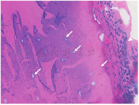 图2 HE染色(×100)示:支气管壁黏膜上皮鳞状化生(箭头),黏膜下骨化及软骨组织骨形成,可见散在支气管软骨细胞(白箭)