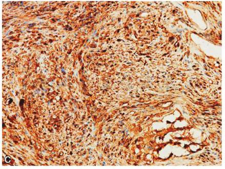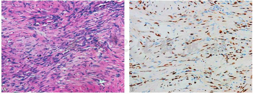 图3 A.(HE,×200)肿瘤细胞呈梭形、部分卵圆形,呈束状排列,Antoni A区(致密区)和Antoni B区(疏松区)交替分布不明显;B.免疫组织化学标记肿瘤细胞(ABC法,×200)SOX-10阳性;C.免疫组织化学标记肿瘤细胞(ABC 法,×200)S-100阳性