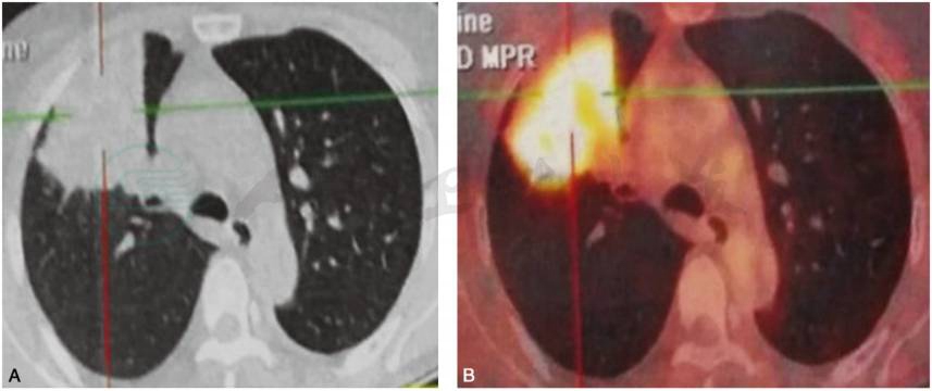 A.胸部CT扫描示右肺上叶前段实变影;B:PET扫描示右肺上叶前段18-FDG异常高代谢病灶,大小约5.8cm×7.0cm×2.8cm 的实质性肿块(平均 SUV:4.3,最大 SUV:8.5),内密度尚均匀