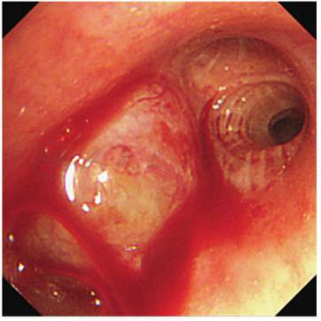 图2 支气管镜示:右肺上叶管口新生物,完全堵塞右肺上叶支气管,触之易出血,色白;右肺中间干通畅