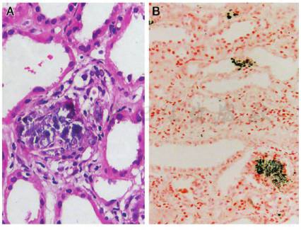 图2 高钙肾病:A:肾小管上皮刷毛缘脱落,管腔扩张,管壁钙质沉积,肾间质轻度水肿(HE×400),B:特殊染色证实肾小管壁和管腔钙质沉积(von Kossa×200)