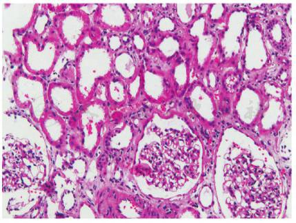 图1 高钙肾病:肾小球无明显病变,肾小管上皮刷毛缘脱落,管腔扩张,肾间质轻度水肿(HE×200)