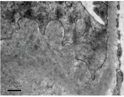 图3 AL型淀粉样变性病:肾小球系膜区可见排列紊乱的细纤维丝,直径约8~10nm,即淀粉样纤维,未见电子致密物(电镜×30 000)
