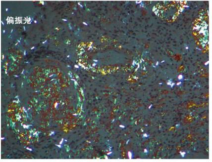 图2 AL型淀粉样变性病:刚果红阳性的肾小球和小动脉显示绿色偏振光(偏振光×200)