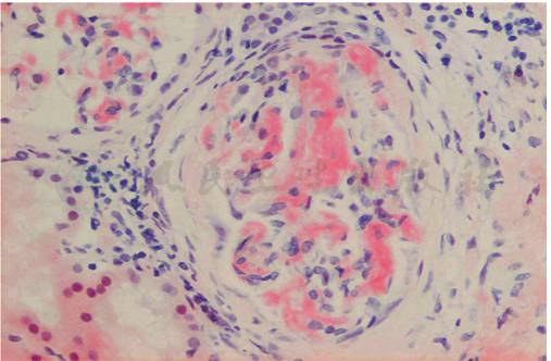 图1 AL型淀粉样变性病:肾小球系膜区大块刚果红染色阳性的特殊蛋白沉积(刚果红染色×400)