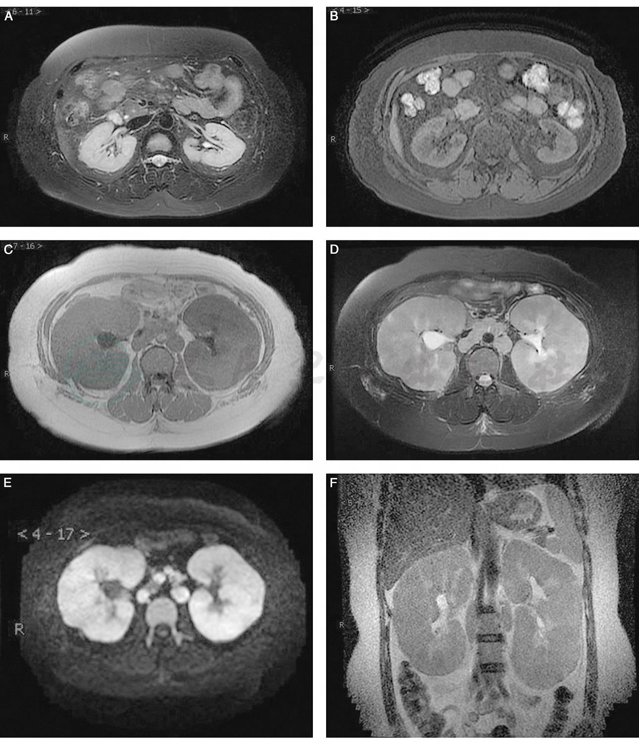 图1 肾脏MRI:双肾弥漫增大,多发结节,腹膜后多发肿大淋巴结