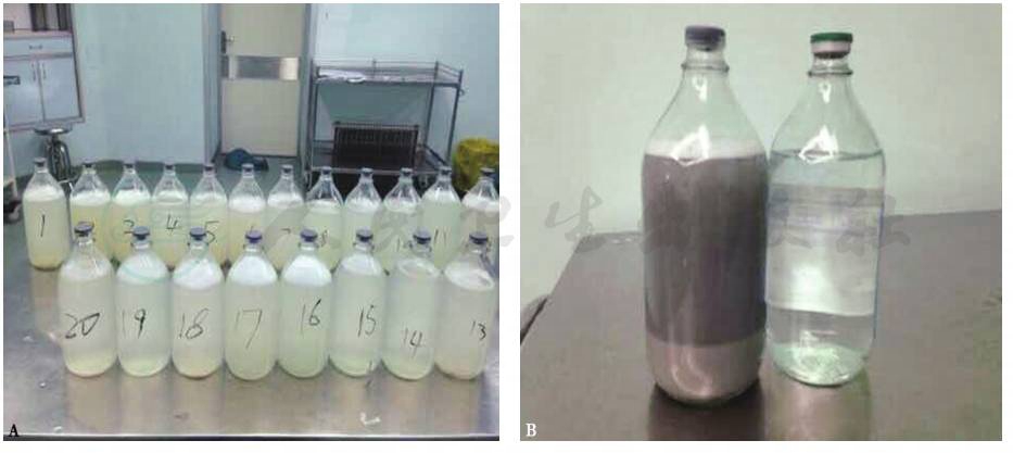 入院后第2周和第3周分别于全麻下行大容量左、右肺灌洗术,灌洗液为牛奶状浑浊液体,沉淀后瓶底见较多沉淀物,漂浮有少量絮状物(图5)。