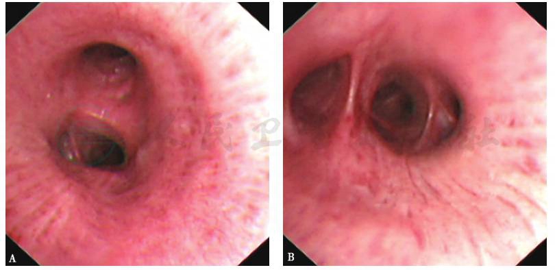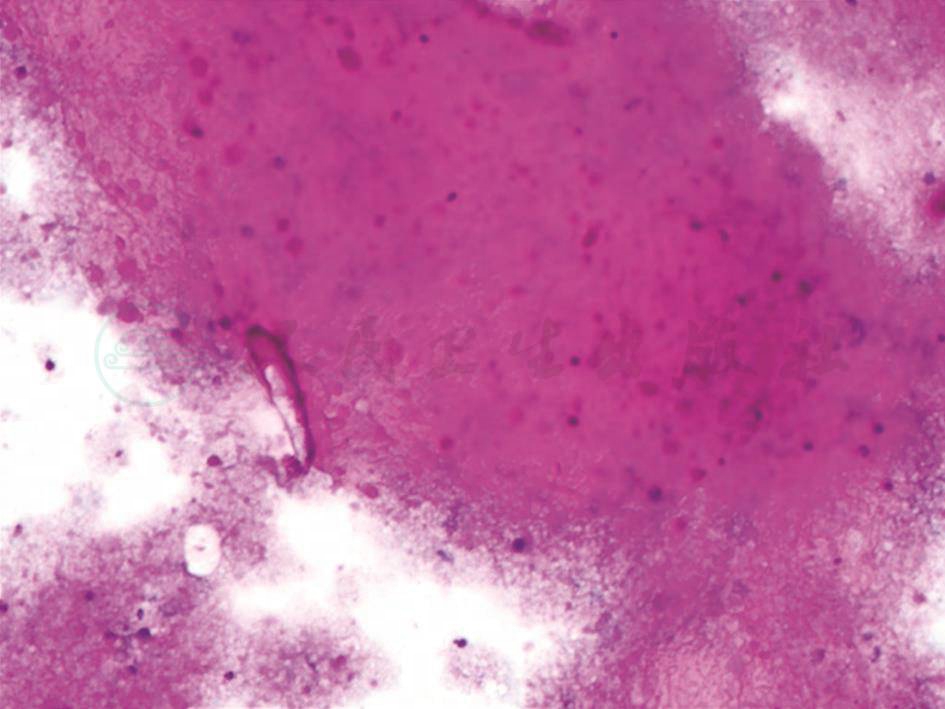 支气管镜检查(入院后第3天):见支气管腔内较多黄色黏稠分泌物,予吸引治疗;各叶段管腔通畅,腔内未见出血、狭窄、新生物(图2);于右上叶行生理盐水灌洗,灌洗液呈浑浊牛奶样改变;支气管镜下右下叶基底段刷检未见癌细胞,刷检找抗酸杆菌阴性;支气管肺泡灌洗液PAS染色阳性(图3)。