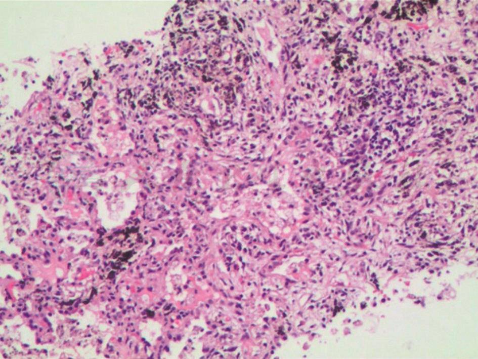 CT引导下经皮穿刺肺活检病理检查(入院后第4天):送检右下肺穿刺活检组织,显微镜下见肺泡间隔增宽、纤维化,有慢性炎症细胞浸润及炭末沉着,肺泡腔内见较多吞噬细胞,未见其他异常表现(图4)。