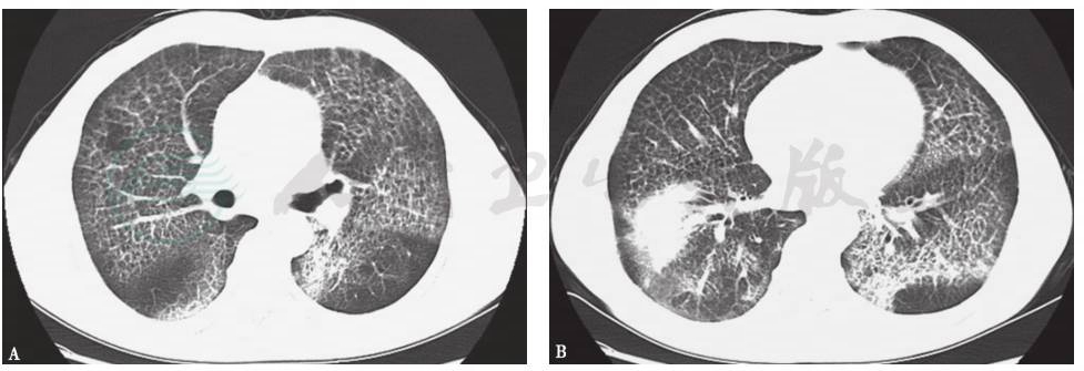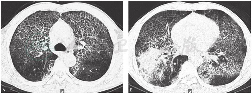 胸部CT可见双肺弥漫性网格状密度增高影(A),右下肺团片状密度增高影(B)