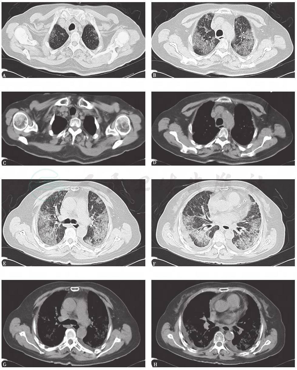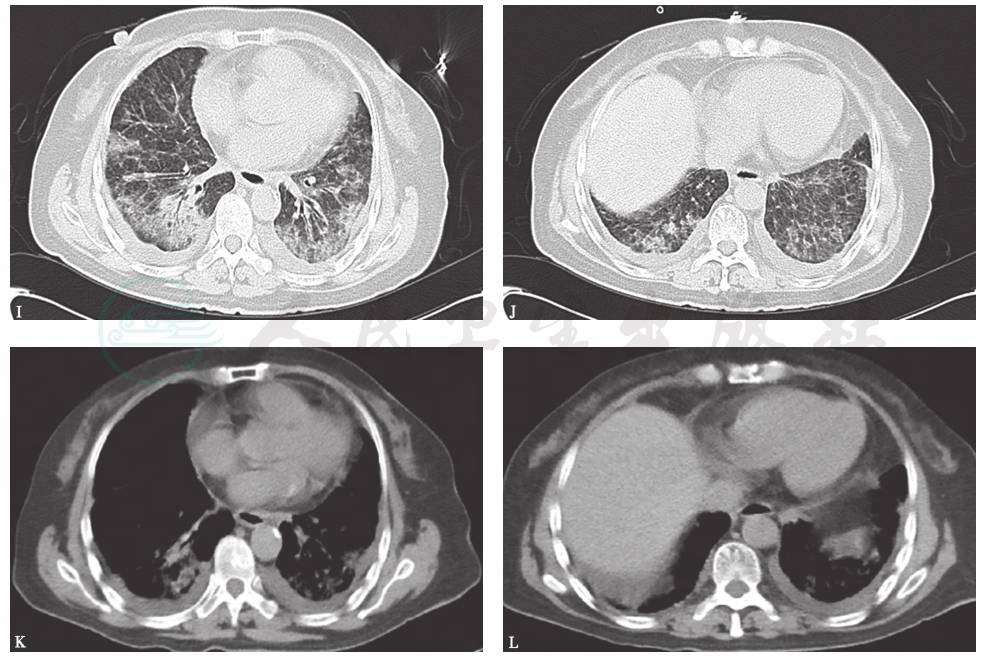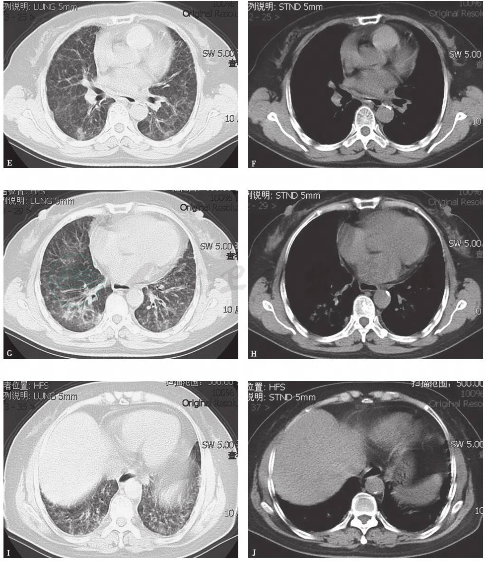 女性患者,62岁,6个月前无诱因出现活动后喘憋,偶有咳嗽,咳少量白色泡沫痰,无发热、胸闷、胸痛,无心悸、气短,无夜间憋醒,休息1~2分钟好转,未进行正规治疗;4个月前活动后喘憋加重,活动耐量下降,当地医院胸部CT示间质性肺炎,口服泼尼松(30mg,每天1次)后病情好转不明显;2个月前无诱因出现双侧下胸侧部胀痛,与呼吸运动无关,咳嗽频繁,偶咳少许白色泡沫痰,于外院门诊采取激素加量治疗(甲泼尼龙80mg,每天1次),3天后喘憋及活动耐量明显改善,遂予口服泼尼松(60mg,每天1次)、环磷酰胺(100mg,每天1次)治疗,1个月前因出现严重脱发,头皮皮疹加重,考虑为药品不良反应,遂停用环磷酰胺,口服激素逐渐减量;1周前泼尼松减至35mg,每天1次时,再次出现上述胸痛症状,以左侧为著,进一步诊治住院。患者自发病以来,无发热、咯血,无心悸、气短,无双下肢水肿,无口干、眼干、光过敏、牙齿脱落、关节痛等,食欲差,睡眠、精神可,尿、便无异常,近6个月体重下降10kg。