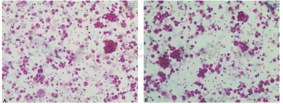 对患者行床旁支气管镜检查,未见异常。于右下叶基底段行支气管肺泡灌洗,BALF外观呈洗肉水样,细胞总数0.21×106/ml(其中,巨噬细胞68%,淋巴细胞28%,中性粒细胞4%)。支气管分泌物及BALF细菌、真菌涂片及培养均阴性,抗酸染色阴性;肺孢子菌PCR、镜检均阴性。BALF病理检查见血性背景中有多量退变的肺泡上皮细胞、吞噬细胞及淋巴细胞,少量中性粒细胞,小团脱落的上皮样细胞可能源于支气管黏膜(图3)。