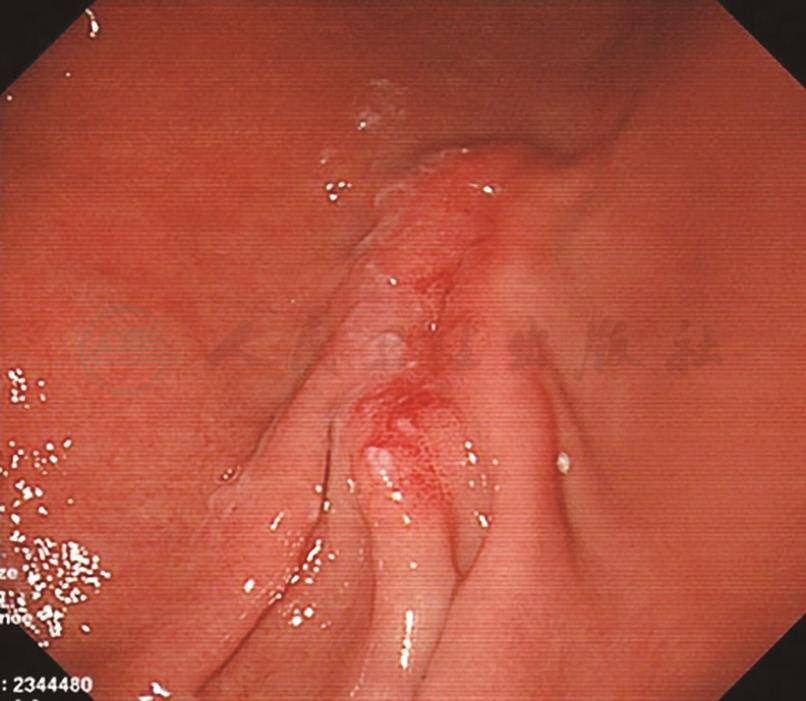镜下见胃体上部大弯侧可见1枚直径约0.5cm的山田Ⅰ型息肉;窦体交界大弯侧可见2条黏膜皱襞,粗大僵硬,范围约4cm×2cm,表面黏膜粗糙、糜烂(图8)。胃镜下诊断:胃窦体交界皱襞粗大,胃息肉,慢性浅表性胃炎。活检组织幽门螺杆菌(helicobacter pylori,HP)阴性。