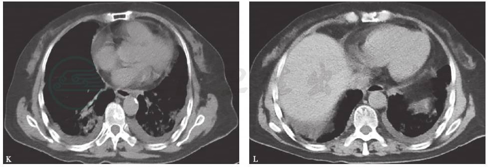胸部CT可见双肺多发斑片影、结节影,双侧少量胸腔积液,少许心包积液